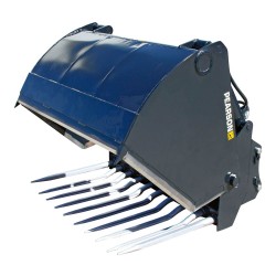 A quick attachment system for coupling and uncoupling implements. You simply unpin the bucket, pin the Quickhitch on and then pick your bucket up with the Quickhitch.